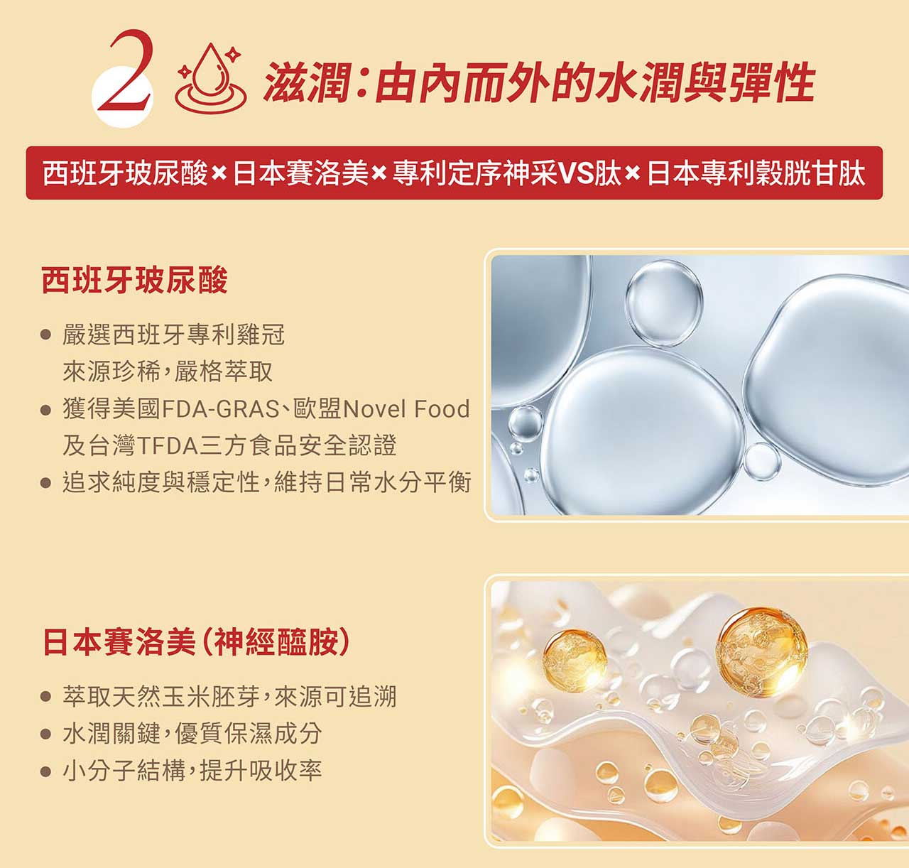 ◎西班牙玻尿酸 & 日本賽洛美 & 專利神采VS肽,水潤透亮